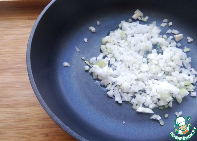 Лук мелко нарезать и обжарить на растительном масле до легкого золотистого цвета.