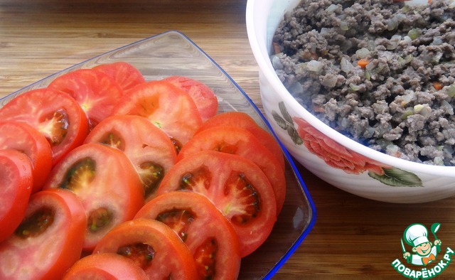 Готовый фарш остудить. Помидоры нарезать кружочками.