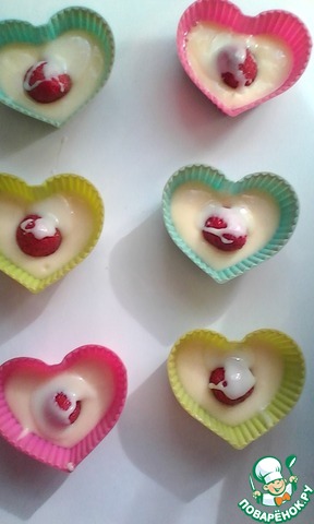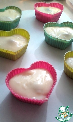 Поцентру формочек выкладываем по одной ягоде клубники и чуть поливаем их сгущеным молоком.