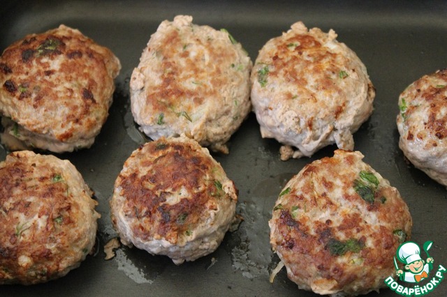 Сформировать 8 фрикаделек, обжарить их на сковороде с двух сторон до румяного цвета и переложить в форму для запекания.