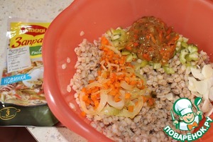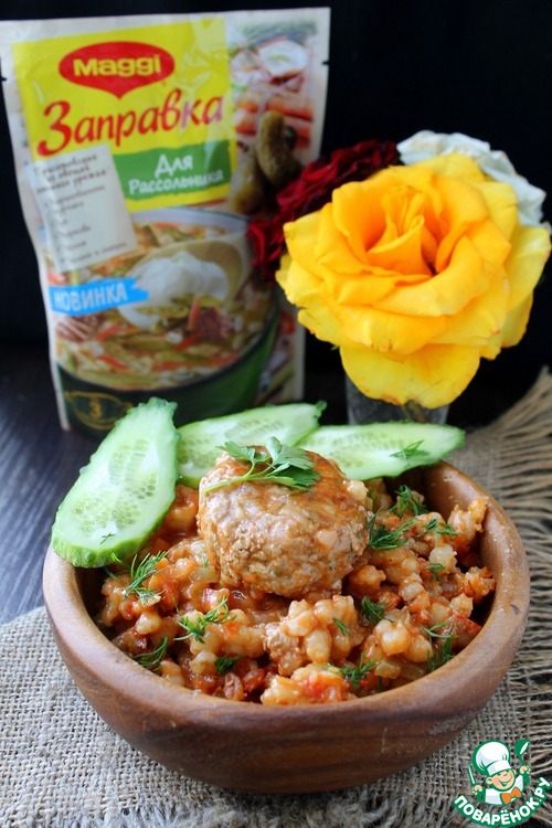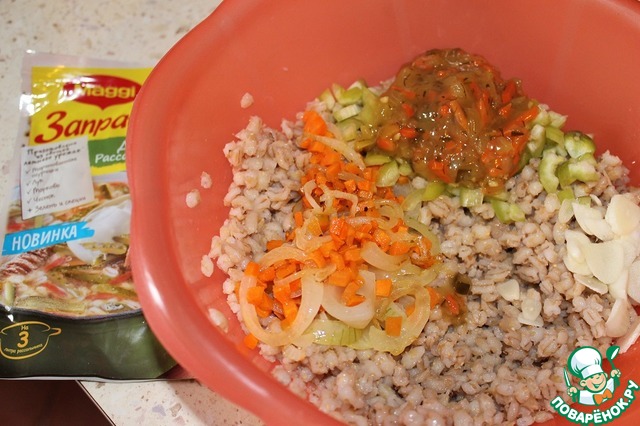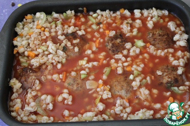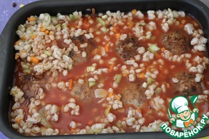Для гарнира: в перловку добавить приправу для рассольника, обжаренные лук с морковью, перец болгарский нарезанный мелкими кубиками и чеснок нарезанный пластинками. Перемешать и выложить в форму к фрикаделькам.