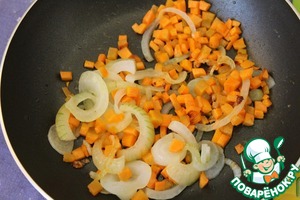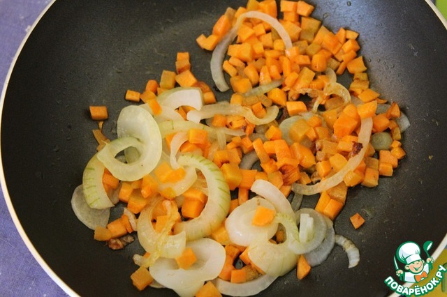 Оставшийся лук нарезать полукольцами и обжарить его вместе с морковью, нарезанной мелкими кубиками, до легкого румянца.