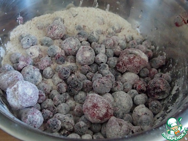 В другую половину муки всыпать ягоды (я брала замороженные, не размораживала - смесь смородины, малины и вишни) и обвалять их в муке, несколько раз встряхнув миску. Потом муку с ягодами добавить к остальным ингредиентам и перемешать.