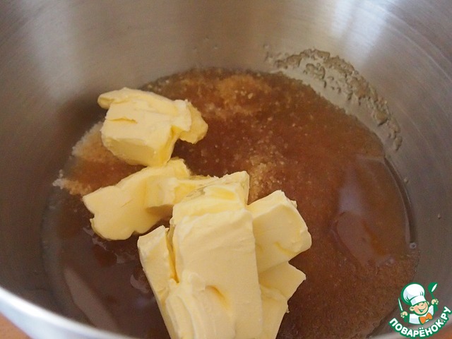 В другой миске смешать коричневый сахар (можно использовать и обычный белый), ванильный сахар, подсолнечное масло без запаха и взбить с размягченным маслом в пену.