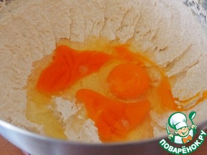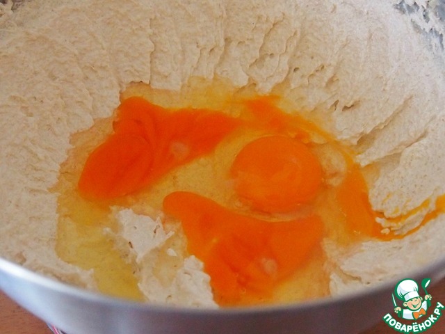 К масляной смеси, продолжая взбивать, добавить яйца и кефир.