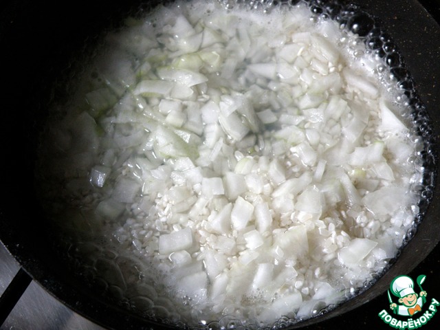 Промытый рис залить кипятком на 5 минут, затем откинуть на сито. Выложить стекший рис в сковороду и сверху уложить слой рубленного лука. Залить водой вровень с рисом и дать закипеть.