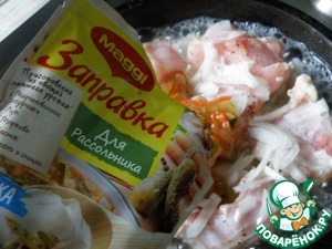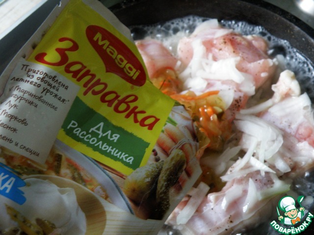 В ленивую сковороду я взяла жирные бочки с брюшками – как раз рис пропитается. А пикантная заправка для рассольника от Магги сделает вкус ярче.