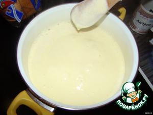 Mолоко доведем до кипения, добавим, помешивая, полученную желтковую смесь и на медленном огне, постоянно помешивая, доведем до загустения.