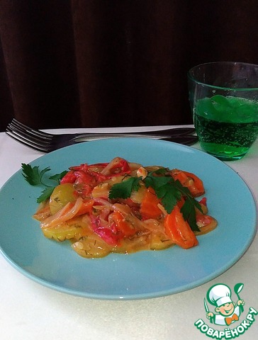 Добавить нарезанный крупными кусочками болгарский перец, перемешать. Тушить, помешивая, до полуготовности перца.