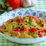 Пока тушится перец, нарезать кабачки и помидоры крупными кусочками.