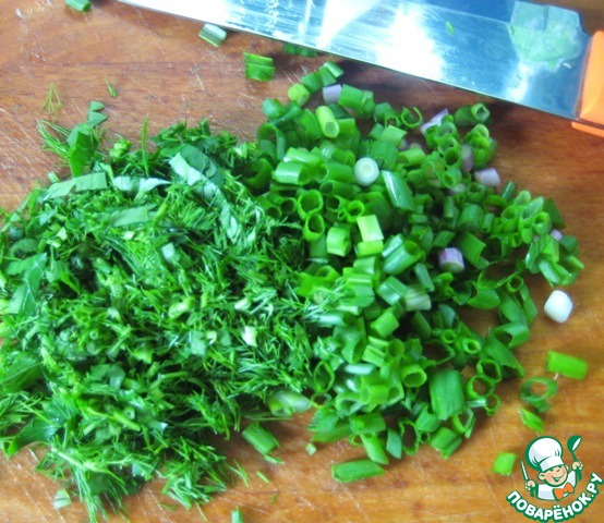 • Мелко нарезать зеленый лук и петрушку с укропом.