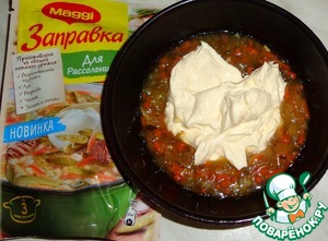 Заправку для рассольника смешиваем со сметаной в отдельной тарелке. Я не добавляю соль, мне хватило солености соуса.