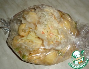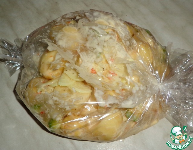 Выкладываем смесь в рукав для запекания. Хорошо завязываем края. Запекаем около получаса в духовке при температуре 180 градусов.