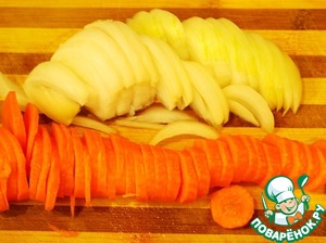 Лук и морковку почистить и помыть. Лук нарезать полукольцами, а морковку кружочками.