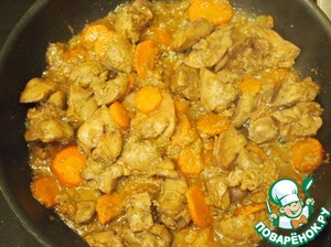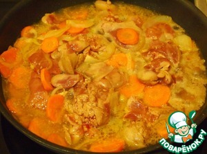 Добавить стакан воды, соль, перец и перемешать. Довести до кипения, затем уменьшить огонь и тушить под крышкой 25 мин.
