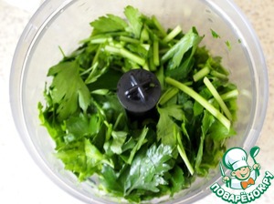 Далее займёмся желе. Для этого в блендер поместить промытую петрушку и добавить 50 мл. воды.