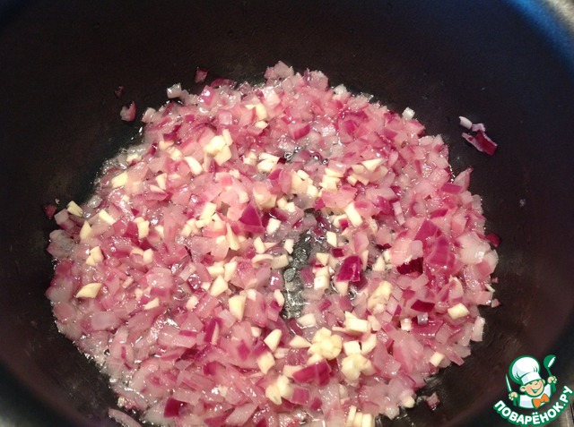 Разогреть в сотейнике или глубокой сковороде масло на среднем огне. Добавить мелко нарезанный красный лук (или обыкновенный репчатый) и готовить до мягкости, около 5 минут. Добавить мелко нарезанный чеснок и жарить до появления аромата, около 30 секунд.