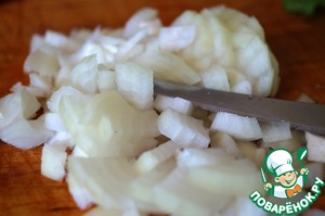 Сначала займёмся луком. Чистим и режем его небольшими кубиками. |