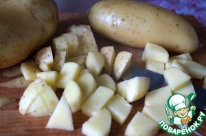 Картофель тщательно моем и режем кубиками, как на винегрет и оливье. Режем, не очищая от кожуры. Как-то, уже давно, я прочитала, что наибольшее количество полезных веществ в картофеле содержится именно в его кожуре и сразу под ней. Впрочем, и пестицидов тоже. Но если вы доверяете производителю или у вас свой картофель - используйте его с кожурой по максимуму. Это добавит пользы и шарма вашему блюду.