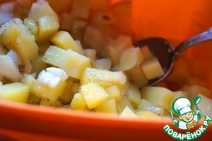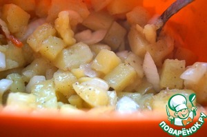 Горячий картофель сразу выкладываем к луку, перемешиваем, пробуем на вкус, корректируем, если нужно.