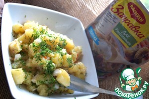 А чтобы иллюзия присутствия огурцов в салате была полной - добавим сюда "Заправку для рассольника". Лук маринуется столько времени, сколько варится картофель. Не бойтесь немного пересолить: картофель и масло в итоге "съедят" излишки соли. -
