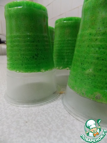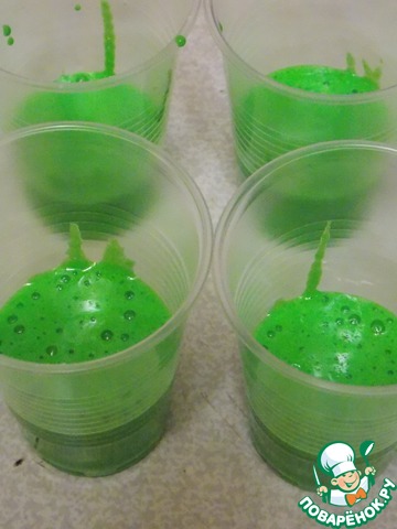 Взбить вместе до плотной пены яйцо, сахар, мед и пищевой краситель зеленого цвета, который не боится тепловой обработки. Муку смешать с разрыхлителем ( он должен быть очень хорошего качества, от этого зависит качество "моха" ), ванилином и аккуратно соединить с яичной массой. Разлить по ОДНОРАЗОВЫМ стаканчикам на 1/3 высоты. Обычно это 6 шт.