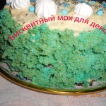 Выпекать в микроволновке в течении 80 сек. при мощности 900. Здесь есть один момент - если передержите,"мох" становится коричневым, если не додержали - плотным и сырым. Так что смотрите по Вашей микре. "Мох" не должен прилипать к пальцам при прикосновении. Вынимаем и переворачиваем вверх дном. Это надо, чтобы бисквит не осел и не уплотнился. После остывания сахар в составе бисквита застынет и бисквит останется в первозданном виде. Еще обязательно подложите что нибудь под один край, чтобы выходил пар. Иначе бисквит отсыреет.