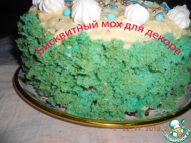 Мне очень нравятся кондитерские изделия в технике велюр, но посмотрев цены на сифоны для него, я погрустнела, не потяну. Но совсем недавно мне попался этот простой рецепт декора, а результат превзошел все мои ожидании. Муж вообще сказал, что он похож на мох ягель. А нам этого и надо.