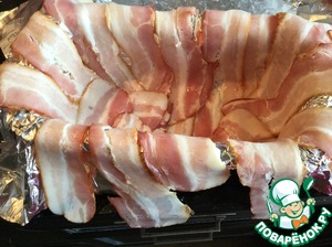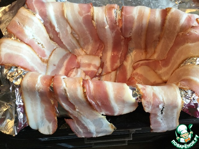 Застелите форму фольгой, выложите бекон, так чтобы края свисали.