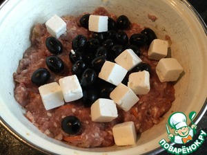 Добавьте оливки и сыр Фета, нарезанный кубиками.