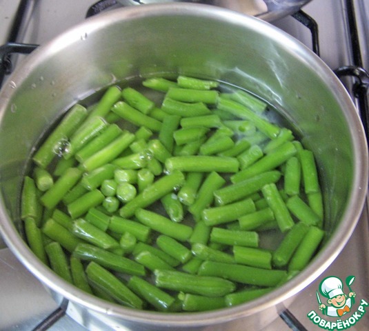 Фасоль опустить в кипящую подсоленную воду и варить 10 минут. -