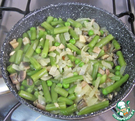 Жарить лук с 3 ст. л. оливкового масла в течение 5 минут, затем добавить шампиньоны, посолить, поперчить.
