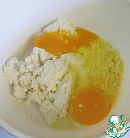 Смешать яйца с солью, рикоттой и 30 г сыра. -