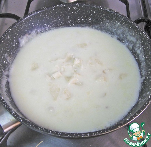 Приготовление соуса. Смешать молоко с овощным бульоном и мукой и прогреть 5 минут, помешивая. Добавить оставшийся сыр, посолить, поперчить.