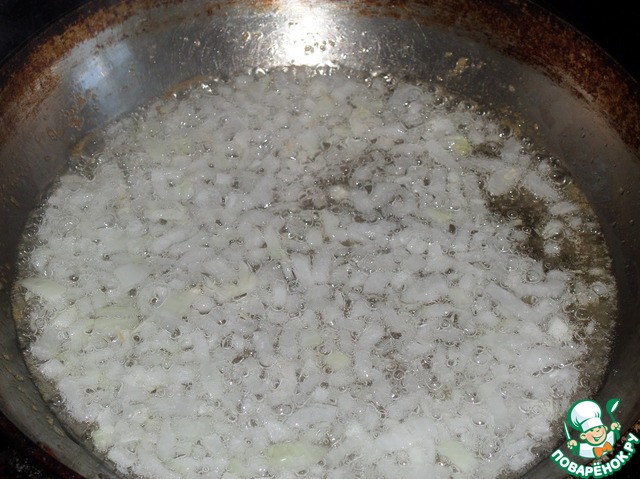 В разогретую сковороду наливаем растительное масло. Выкладываем лук и обжариваем 1-2 минуты.