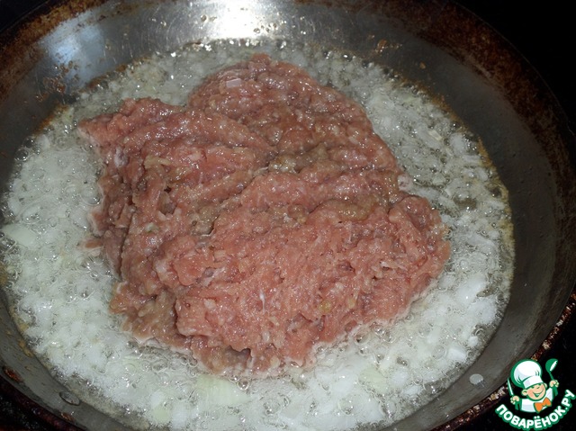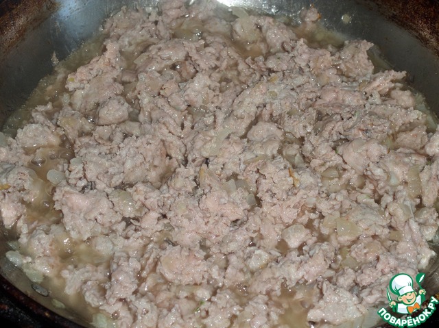 Затем в сковороду добавляем мясной (куриный) фарш.