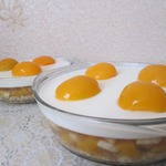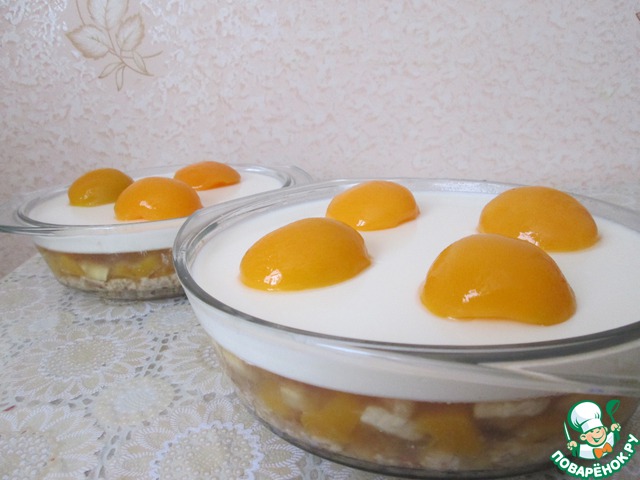 Из компота откладываем половинки персиков 4 штучки. Остальные персики режем, заливаем раствором желатина. Персиков у меня было мало, поэтому я взяла еще и тыкву, приготовленную в свч.