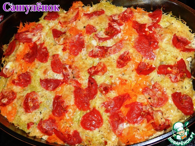 Молодой кабачок и морковь натрите на средней терке и выложите на заливку (я выложила полосками, чередуя морковь с кабачками).