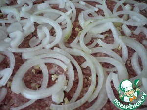 Лук нарежьте тонкими полукольцами. Выложите сверху мясного фарша.