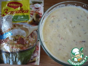 Теперь нужно приготовить заливку для запеканки. Смешайте яйца, сметану, твердый сыр и заправку для рассольника, MAGGI.