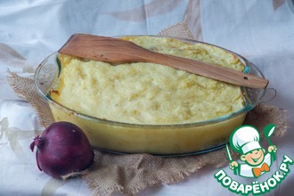 Очищенный картофель натрите на средней терке и распределите равномерным слоем по дну формы. Немного посолите. -