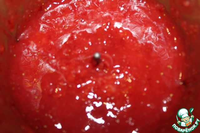 Клубнику измельчим в блендере с 1 ст. л. пудры. Чтобы ягоды быстрее превратились в однородное пюре, можно добавить 1 ст. л. кипяченой воды.