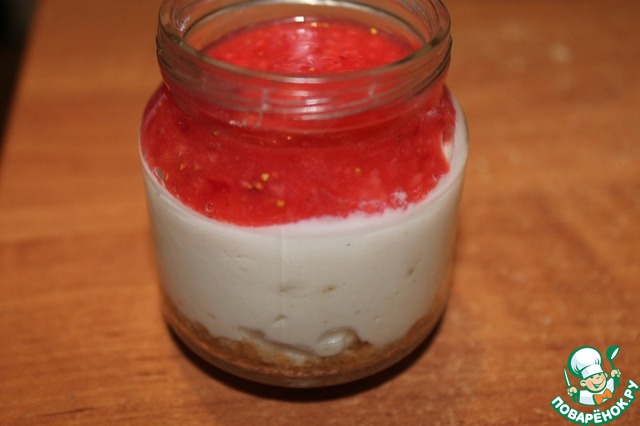 Смешаем измельченное печенье и масло. В маленькие баночки (у меня из-под детского питания) выкладываем слоями: печенье, крем из рикотты, клубничный топпинг.