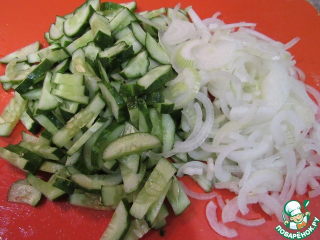 Когда огурцы постоят - выделится достаточно много жидкости. Мы ее сливаем и очень хорошо промываем огурцы.