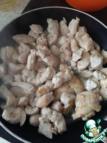 Куриное филе нарезать небольшими кусочками, посолить, добавить чеснок и смесь перцев, оставить мариноваться минут 10. Затем обжарить до золотистого цвета