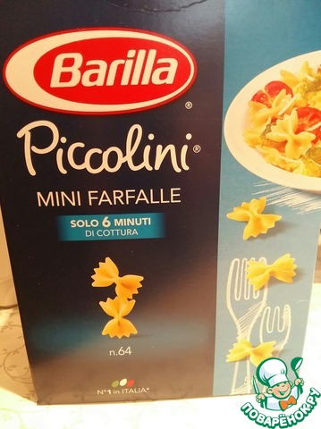 Пасту отварить до готовности согласно инструкции. У меня паста Barilla, бантики