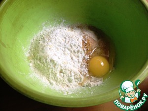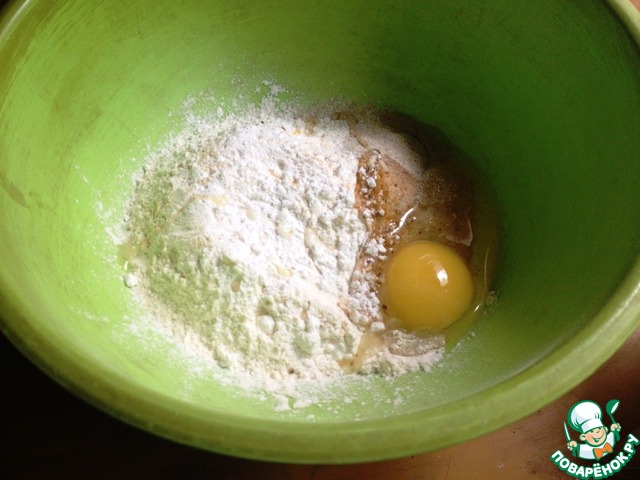 Смешать сахар, пшеничную и цельнозерновую муку, разрыхлитель и яйцо.