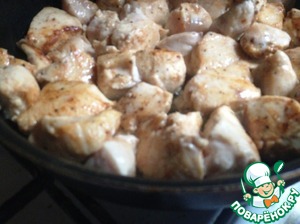 Куриное филе вымыть, обсушить, порезать кубиками. Посолить. Поперчить. Посыпать приправой.