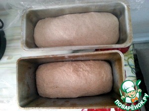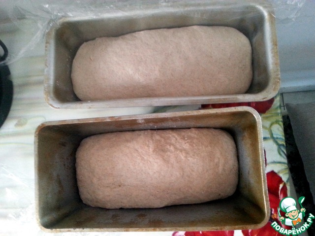 Тесто вывалить из чаши миксера и домесить руками, оно должно быть эластичным, мягким и чуть липким. Положить в большую миску, чтобы тесто могло увеличиться в два, три раза. Накрыть пищевой плёнкой на два, три часа. Подошедшее тесто обмять и разделить на две части. Формы смазать маслом и присыпать мукой, положить тесто в формы, накрыть пищевой плёнкой и дать отдохнуть ещё 60-90 минут.