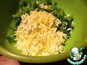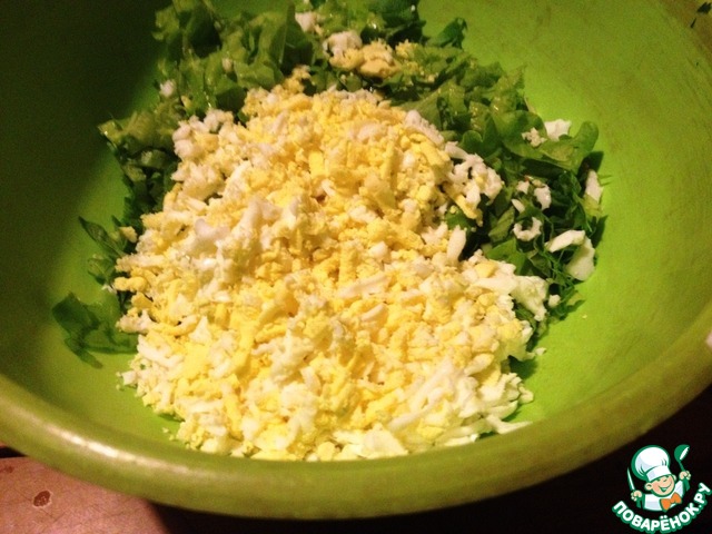 Сваренное вкрутую яйцо натереть на тёрке. Посолить.